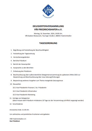 8. Beschlussfassung über außerordentliche Delegiertenversammlung bis spätestens Mitte 2025 zur Besprechung und Beschlussfassung über neue Satzung/Ordnungen