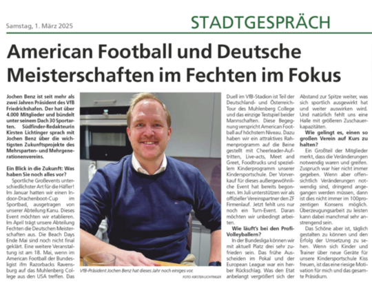 Sportliche Großevents unterschiedlichster Art für die Häfler! Im Januar hatten wir einen Indoor-Drachenboot-Cup im Sportbad, ausgetragen von unserer Abteilung Kanu. Dieses Event möchten wir etablieren. Im April trägt unsere Abteilung Fechten die Deutschen Meisterschaften aus. Die Beach Days Ende Mai sind noch nicht final geklärt. (Anmerkung: Nach Aufzeichnung des Interviews wurde entschieden, dass die Beach Days 2025 nicht stattfinden können). Eine weitere Veranstaltung ist am 18. Mai, wenn im American Football der Bundesligist ifm Razorbacks Ravensburg auf das Muhlenberg College aus den USA treffen. Das Duell im VfB-Stadion ist Teil der Deutschland- und Österreich-Tour des Muhlenberg College und das einzige Testspiel beider Mannschaften. Diese Begegnung verspricht American Football auf höchstem Niveau. Dazu haben wir ein attraktives Rahmenprogramm auf die Beine gestellt mit Cheerleader-Auftritten, Live-acts, Meet and Greet, Foodtrucks und speziellem Kinderprogramm unserer Kindersportschule. Der Vorverkauf für dieses außergewöhnliche Event hat bereits begonnen. Im Juli unterstützen wir als offizieller Vereinspartner den ZF Firmenlauf. Jetzt fehlt uns nur noch ein Turn-Event. Daran möchten wir unbedingt arbeiten.