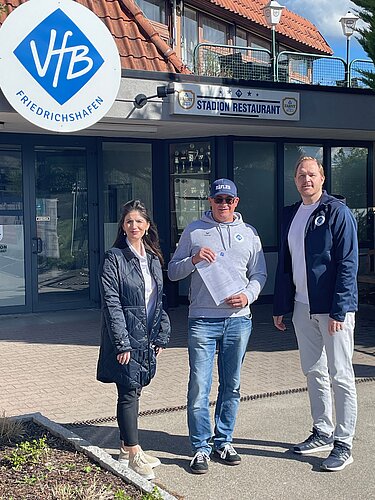 Erstes abteilungsübergreifendes VfB-Fördermitglied: Eberhard Schmid, eingerahmt von VfB-Vereinsmanagerin (links) und VfB-Präsident Jochen Benz (rechts).