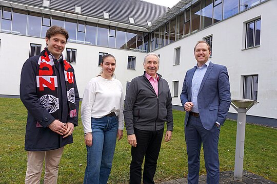 Bildunterschrift 1: Freuen sich über die Kooperation zwischen VfB Friedrichshafen, Zeppelin Universität und DHBW Ravensburg: Moritz Falckenberg (ZU Hochschulsport), Keara Hartschuh (Studierendenvertretung DHBW Ravensburg), DHBW-Campus-Chef Prof. Dr. Heinz-Leo Dudek und VfB-Präsident Jochen Benz.