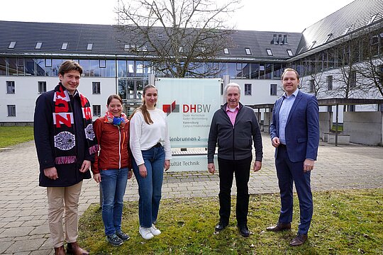 Bildunterschrift 2: Freuen sich über die Kooperation zwischen VfB Friedrichshafen, Zeppelin Universität und DHBW Ravensburg: Moritz Falckenberg (ZU Hochschulsport), Kristin Brüning (DHBW Ravensburg), Keara Hartschuh (Studierendenvertretung DHBW Ravensburg), DHBW-Campus-Chef Prof. Dr. Heinz-Leo Dudek und VfB-Präsident Jochen Benz.