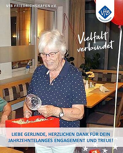 Liebe Gerlinde, dein VfB Friedrichshafen e.V. gratuliert dir ganz herzlich und bedankt sich für deine jahrezehntelange wertvolle Arbeit, Treue und Verbundenheit!
