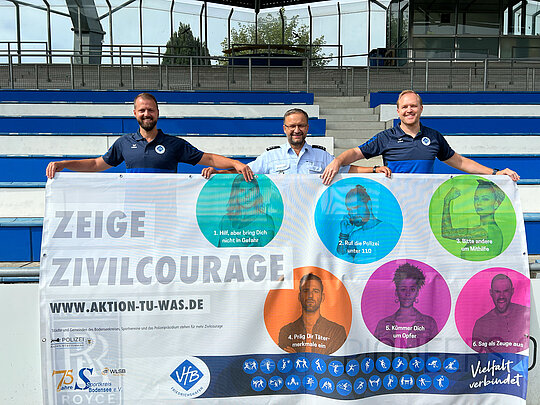 Flankierend zu den Gelenkbussen als Werbeträger wurde im Frühjahr 2023 in Kooperation zwischen dem Sportkreis Bodensee, vielen Sportvereinen, Städten und Gemeinden des Bodenseekreises eine große Plakataktion mit Bannern an den Start gebracht. Der VfB Friedrichshafen wurde angefragt, als Aushängeschild zu dienen: „Die Aktion hat für uns einen sehr hohen Stellenwert. Natürlich, weil wir sensibilisieren wollen, noch genauer hin- und nicht wegzuschauen. Aber auch, um einen breiten Schulterschluss zwischen Sport und Polizei in diesem wichtigen Thema herauszustreichen“, erklärt VfB-Präsident Jochen Benz. Neben dem Anbringen von zwei Bannern im VfB-Stadion und in der SPACETECH ARENA, der neuen Spielstätte der VfB-Volleyball-Profis, werden insbesondere vereinsinterne Informationskampagnen gestartet. Thilo Späth-Westerholt, Geschäftsführer der Volleyball GmbH: „Jeder kann in eine solche Situation geraten, ob als Opfer oder als Zeuge einer Straftat. Es ist wichtig, sich in solchen Momenten richtig zu verhalten, um zu helfen und sich nicht selbst zu gefährden. Als Bundesligist erreichen wir mit dieser Botschaft sehr viele Menschen, auch über den Bodenseekreis hinaus.“